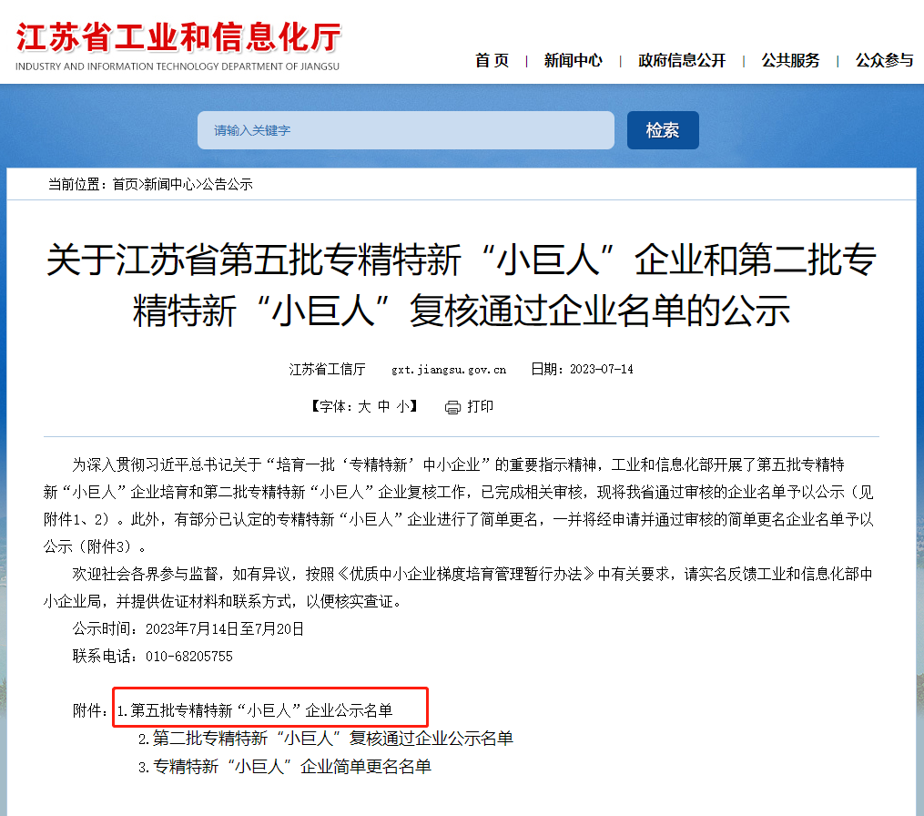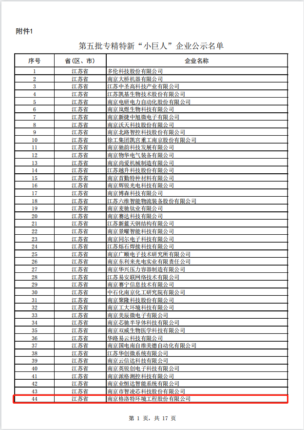 7月14日,江蘇省工業和信息化廳公布了江蘇省第五批國家專精特新“小巨人”企業公示名單。經過層層嚴格遴選,南京格洛特環境工程股份有限公司(以下簡稱“南京格洛特環境”)入選第五批專精特新“小巨人”企業公示名單。